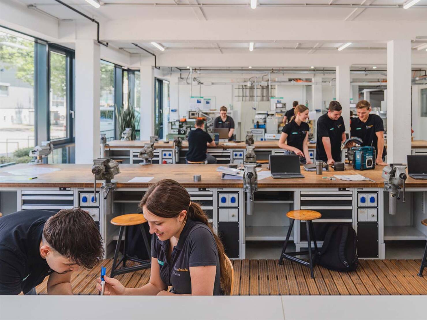 Wenn auch dich clevere Lösungen auf kleinstem Raum beflügeln, bist du in der Hansgrohe Talentschmiede genau richtig. Talentschmiede? So heißt unser hochmodernes Ausbildungszentrum für technische und kaufmännische Ausbildungen in Schiltach. Im Mittelpunkt steht die große Lehrwerkstatt mit Arbeitsplätzen für die Auszubildenden sowie Fräs-, Dreh- und CNC-Maschinen. Dazu kommen ein moderner Schulungsraum, Aufenthalts- und Besprechungsräume sowie das Büro des Ausbildungsteams. Alles unter einem Dach.