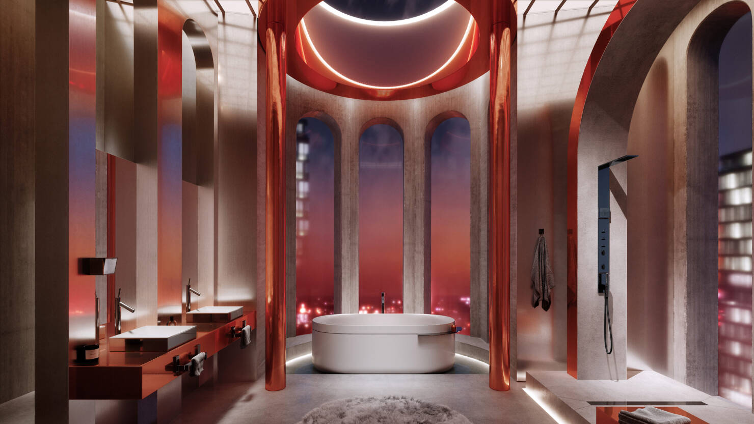 “ Gleichzeitig ergibt sich aus dem Polished Black Chrome der Armaturen ein dynamisches Wechselspiel mit den roten Reflexen der umgebenden Stadt, verstärkt durch die chromglänzenden Säulen. Betonböden und Oberflächen aus gebürstetem Aluminium sorgen für das von Penasse erwähnte Gleichgewicht, ebenso wie die AXOR Suite Waschtische und die Badewanne. Die aus weißem SolidSurface gefertigten AXOR Suite Produkte sind mit Polished Black Chrome Elementen versehen, die ihren klaren und zeitlosen Formen eine persönliche Note verleihen.