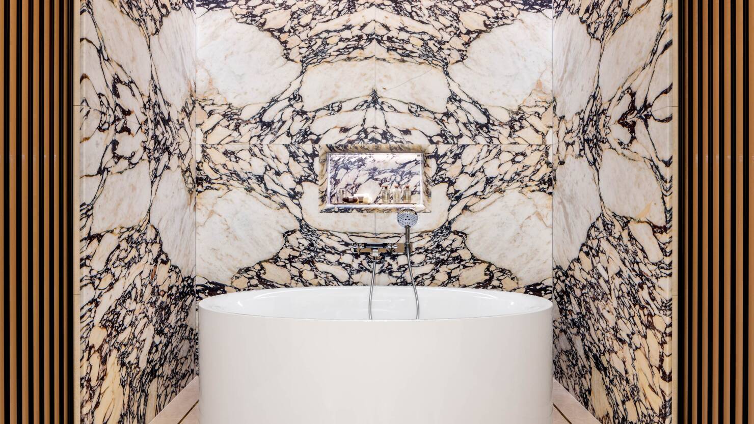 Housed within a rationalist building by Vittorio Ballio Morpurgo and directly facing the ancient Mausoleum of Augustus and Ara Pacis monument, the Bulgari Hotel Roma had no other choice than to be an epic homage to the brand’s hometown. Inside, breathtaking Murano chandeliers, a kaleidoscopic blend of Italian stone and a medley of impeccable Italian fittings instantly immerses guests in an ambiance of total luxury. The public spaces follow suit, with a 2000-year-old marble statue of Augustus, public library of Roman arts and sprawling rooftop giardino being just some of the sights to behold.