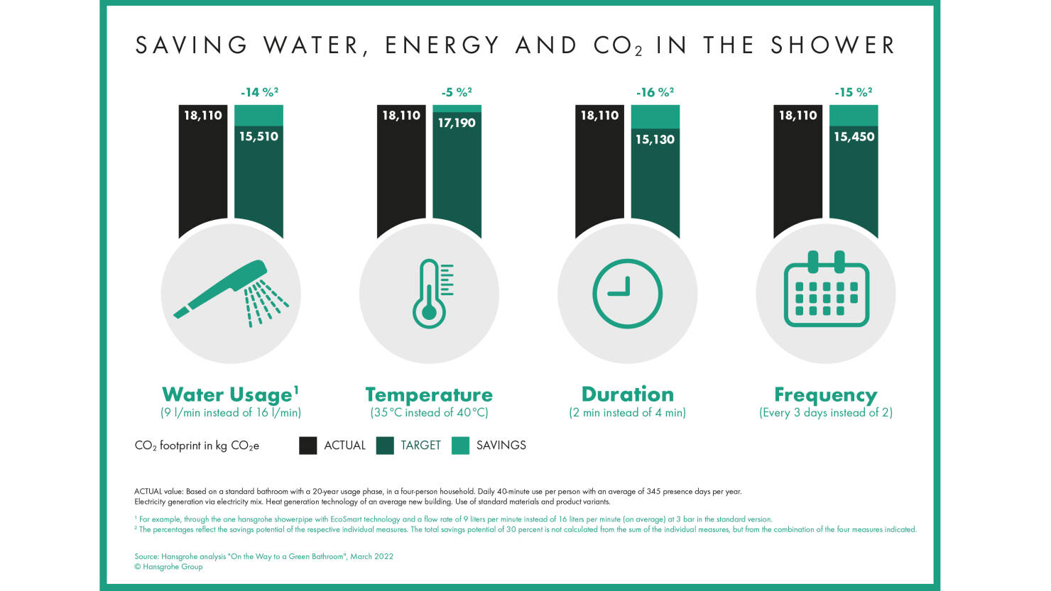 *** The percentages in parentheses indicate the savings potential of the individual measures. The total savings potential of 30 percent is not calculated from the sum of the individual measures, but from the combination of the four measures indicated. Source: Hansgrohe analysis "On the Way to a Green Bathroom".