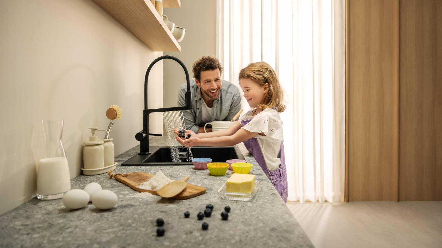 Schiltach, September 2024. Whether as a meeting place for the family, a space for creative cooking adventures or a stylish backdrop for sociable evenings with friends - the kitchen is at the heart of modern living. The importance of the kitchen mixer tap is often underestimated, even though it plays a central role in many areas of our everyday lives. We use them more often than we perhaps realize; possibly even more often than any other kitchen appliance. With the new hansgrohe Talis Select M54 PowderSpray kitchen mixer, hansgrohe is bringing a breath of fresh air into the kitchen. The swivel spout features the particularly water-saving PowderSpray spray mode. This allows the flow rate to be limited. Fine micro-nozzles create a gentle stream of water that makes everyday kitchen tasks much more pleasant and sustainable. Talis Select M54 PowderSpray is only available as an EcoSmart variant* with a maximum flow rate of less than six liters per minute at three bar. The average consumption of a hansgrohe kitchen faucet is almost ten liters per minute. Thanks to the precise and full-surface PowderSpray, fruit and vegetables can be cleaned in a resource-friendly yet thorough manner. In addition, the soft spray ensures comfortable hand washing without any annoying splashing.